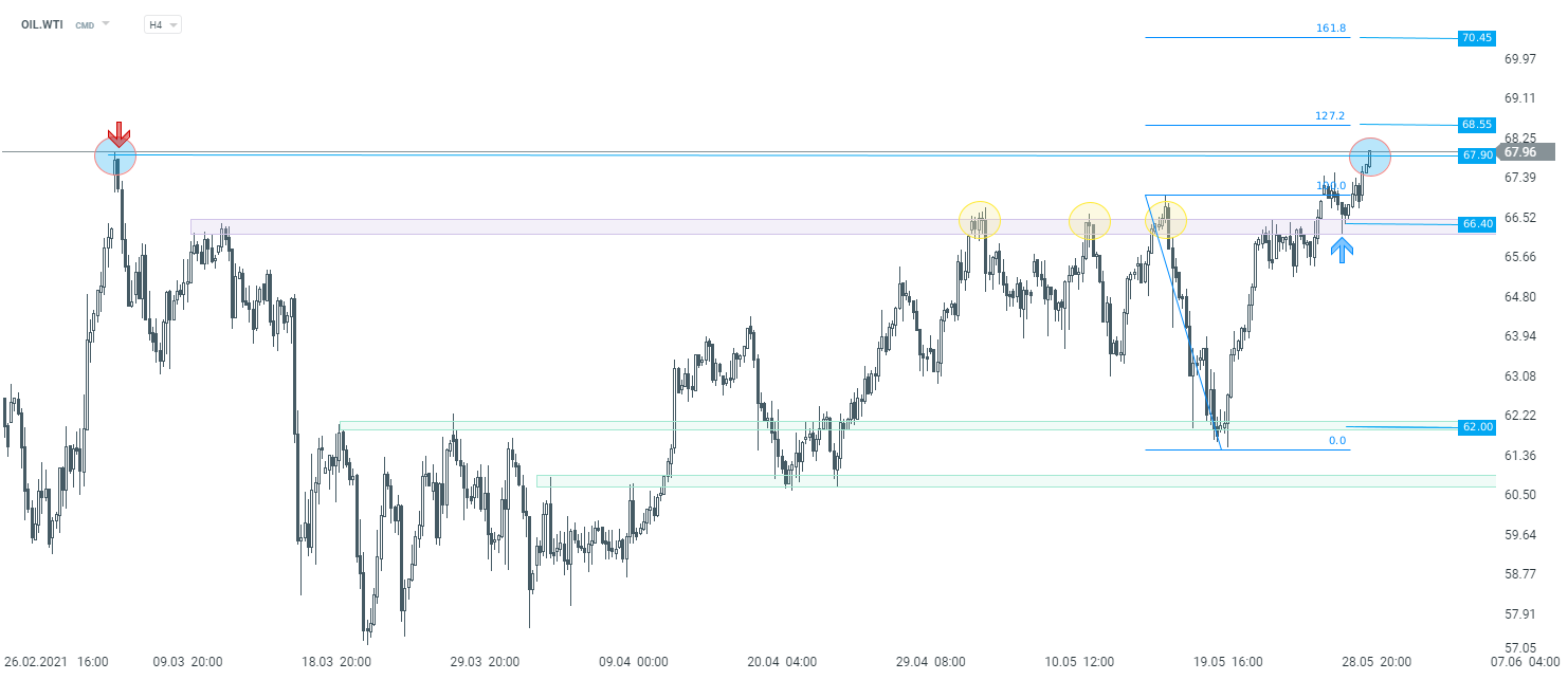 On Tuesday morning, crude oil prices rose by more than 1.5% and OIL.WTI reached the highest levels this year. OIL lags slightly behind, but is also close to establishing new local highs. The upward move can be linked to today's OPEC + meeting, where agreement may be reached regarding the volume of "black gold" extraction in July. However, unofficial reports indicate that the group may withhold this decision due to concerns regarding Iran and the nuclear deal that will determine whether Iranian oil will hit the market.