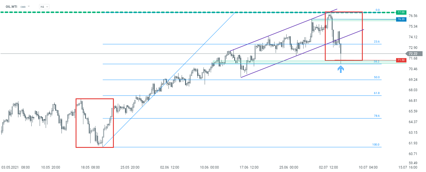 OIL.WTI price broke below the lower limit of the upward channel, and then the downward movement accelerated. However, the declines stopped around the major support at $71.50, which is marked with the lower limit of the 1: 1 structure and 38.2% Fibonacci retracement of the last upward wave. Source: xStation5