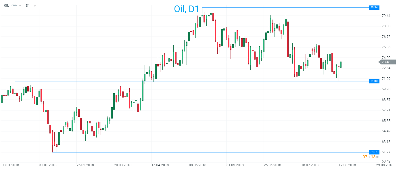 Oil remains in a broader range from 71.00-80.54 after once more respecting the lower bound yesterday with a large wick below the D1 candle indicative of strong buying pressure. Source: xStation