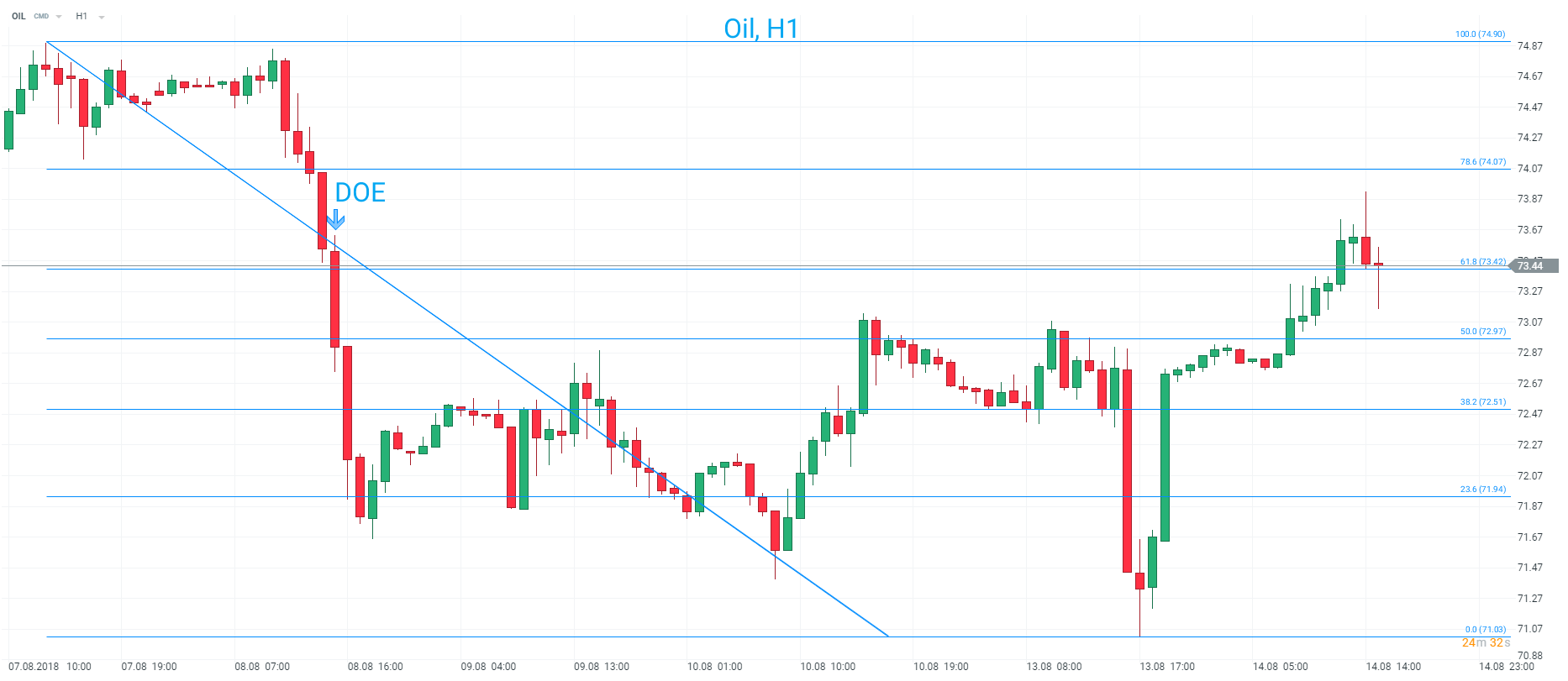 Oil has recovered the majority of the declines seen last week, with the market back above the 61.8% fib. Source: xStation