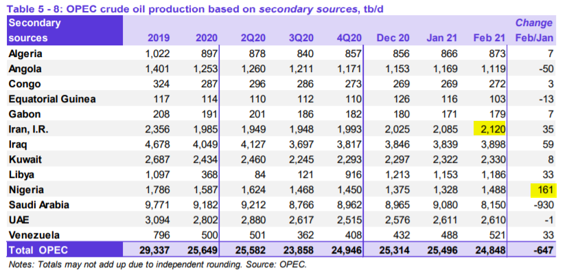 In February, OPEC produced less than 25 mbd. The next months will be similar as Saudi Arabia cuts production by an additional 1 million barrels per day. There is still a lot of potential in Iran, which produces about 2 mbd. Source: OPEC