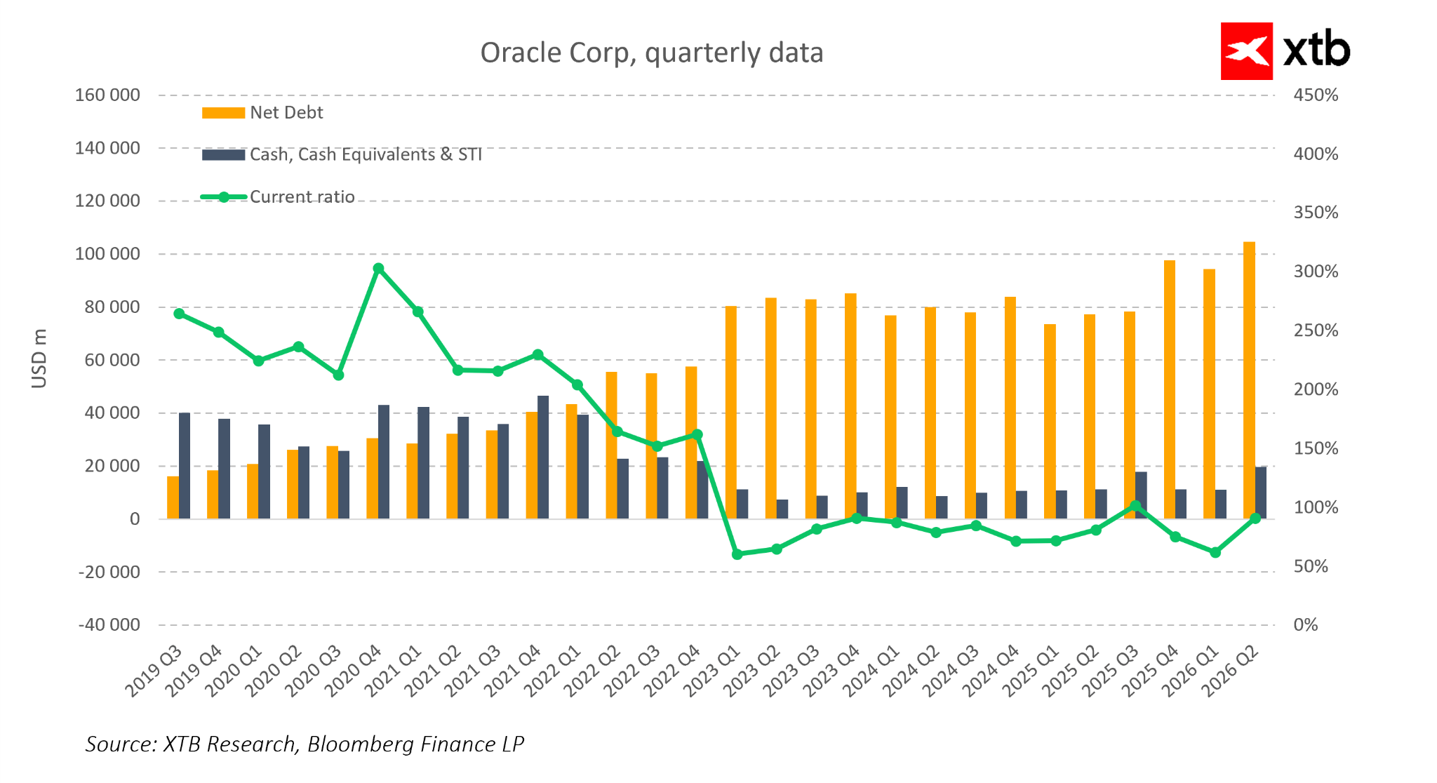 Exploding CAPEX and debt — a growing market risk. Oracle increased capital expenditures in Q2 FY2026 to ~35 bn USD for data centers and GPU clusters for AI, while total debt has climbed to an estimated ~115–120 bn USD. The market is growing increasingly concerned about the scale of spending and its impact on the balance sheet. Future performance will depend heavily on how quickly these investments convert into revenue and cash flow.