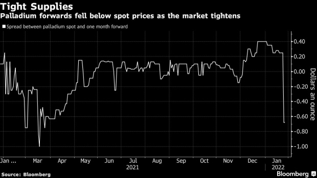 A significant increase of palladium spot price over futures price points to an increased interest in palladium for immediate delivery. Such a situation can be reasons with concerns over possibility of sanctions being imposed on Russian deliveries. Source: Bloomberg