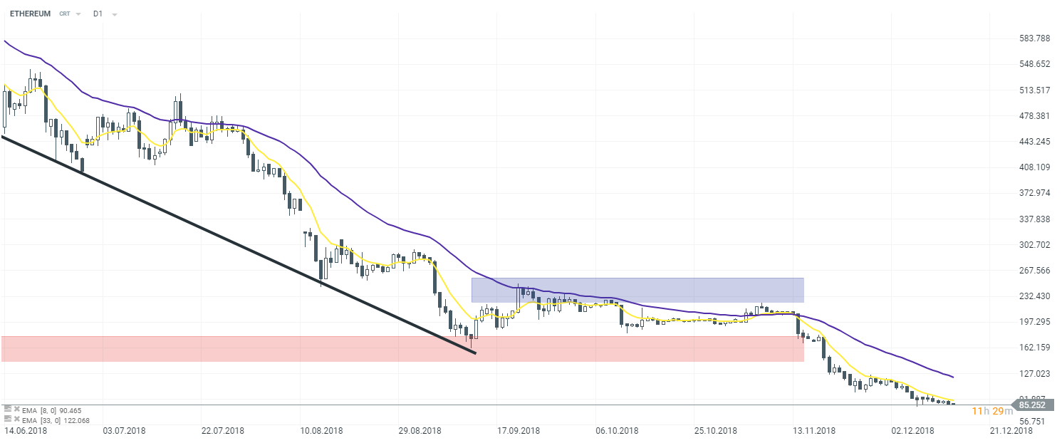 Ethereum experienced a huge sell-off in recent weeks. The digital currency has dropped from nearly $210 to around $85 since mid-November. Nevertheless, Friday’s trading has been rather calm for the third largest cryptocurrency so far. Source: xStation5