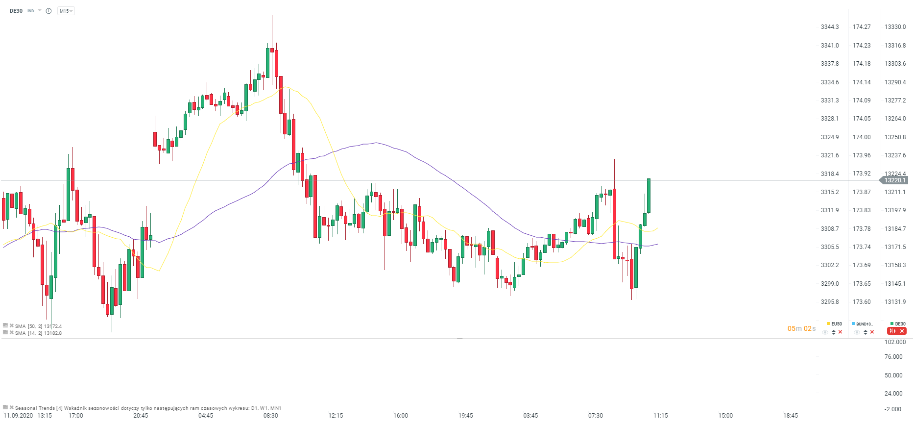 DAX kontynuuje wyraźne odbicie dzisiejszego dnia z okolic poziomu 13150 punktów. Źródło: xStation5