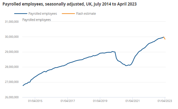 Preliminary data from the UK's tax office showed the first drop in total headcount in more than two years in April, down 136,000 from March. Source: ONS
