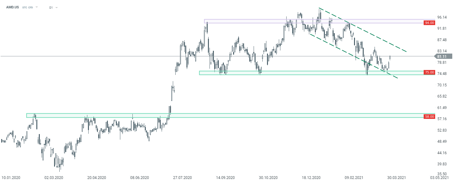 Advanced Micro Devices, Inc. is an American multinational semiconductor company based in Santa Clara, California, that develops computer processors and related technologies for business and consumer markets. AMD's main products include microprocessors, motherboard chipsets, embedded processors and graphics processors for servers, workstations, personal computers and embedded system applications. Company' shares rose sharply during last year however bulls failed to uphold momentum during the first quarter of 2021 and stock dropped nearly 15%. However when we look at the numbers, the situations don't look so bad. In January the company posted upbeat Q4 2020 earnings. Chipmaker expects that this year sales will increase 37% to $13.4 billion with a 47% gross margin. In 2020, it had $9.8 billion in sales and 45% gross margins. Given operating profits were about 38% of its gross profit, AMDs operating profit should increase by 44% to $2.39 billion. On the other hand, stock is still one of the most expensive among other semiconductors companies, and the acquisition of Xilinx,which has clearly weighed down the stock during the first quarter of the year, may negatively affect the existing shareholders of AMD,