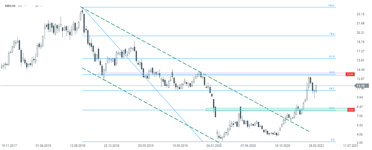 Marathon Oil Corporation is an American petroleum and natural gas exploration and production company headquartered in the Marathon Oil Tower in Houston, Texas. Company is involved in prolific oil-producing resource plays, including the Eagle Ford in Texas, the Bakken in North Dakota, the STACK and SCOOP in Oklahoma, and the Permian Basin in New Mexico. Also, it has international production and operations in Equatorial Guinea, located on the west coast of South Africa. Stock rose more than 57% in the first quarter of 2021. This week's upward move accelerated after the company announced that it sent an irrevocable notice of its intention to fully redeem its currently outstanding $500 million aggregate principal amount of 2.8% Senior Notes Due 2022 (the "Notes") on April 29, 2021 (the "Redemption Date"). This transaction will reduce gross debt by $500 million and annual cash interest expense by $14 million. This move is in line with the company's objective to continue improving its investment-grade balance sheet through gross debt reduction and sustainable free cash flow generation.