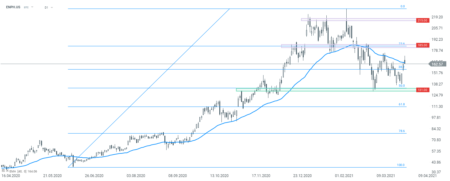 Enphase Energy is a NASDAQ-listed energy technology company headquartered in Fremont, California. Enphase designs and manufactures software-driven home energy solutions that span solar generation, home energy storage and web-based monitoring and control. The company's stock fell more than 20% since the beginning of the year as the general rotation out of the renewable energy sector began after it outperformed most sectors in 2020. Also news that company's President & CEO Badrinarayanan Kothandaraman sold 27,394 shares worth $4million on 03/30/2021 at an average price of $146.31 a share also weighed on market sentiment. However it is worth taking into account that Enphase Energy has earned almost $134 million last year and was in fact profitable unlike its competitors like Plug Power and Bloom Energy. Enphase also recently announced a strategic partnership to grow its solar technology business in South Africa.