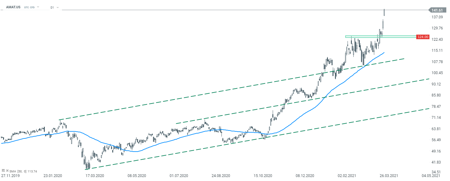 Applied Materials is an American corporation that supplies equipment, services and software for the manufacture of semiconductor (integrated circuit) chips for electronics, flat panel displays for computers, smartphones and televisions, and solar products. The company also supplies equipment to produce coatings for flexible electronics, packaging and other applications. The company's stock rose nearly 54% in the first quarter amid upbeat earnings report, but also from strong results from peers and customers that forecast heavy spending on semiconductor equipment this year. Investors also welcomed recent news that Applied Materials approved a new $7.5 billion stock buyback authorization which supplements the previous authorization, which has about $1.3 billion remaining. Also this week the company canceled plans to acquire the Japanese company Kokusai Electric for $3.5 billion and some analysts expect that some of these funds may also be used for share buyback. More volatility is expected during the company's investor day on April 6th during which company will provide more details on its "longer-term market outlook, opportunities, strategies, product and technology road maps, and financial targets."