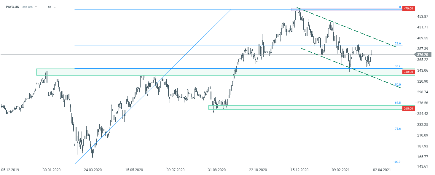 Paycom Software, Inc. is an American online payroll and human resource technology provider based in Oklahoma City, Oklahoma. It is attributed with being one of the first fully online payroll providers. Company sells human capital management software to organizations and generates a bulk of its revenues from payroll processing. Paycom had a difficult first quarter and its stock fell more than 17%. However the U.S. labour market has been recovering in recent months amid easing business restrictions, falling coronavirus infection rates, a fast vaccine rollout and continued support from the government. Rising economic activity should benefit employment services businesses as the labor participation rate improves and furloughed employees return to work, which should increase demand for Paycom services.