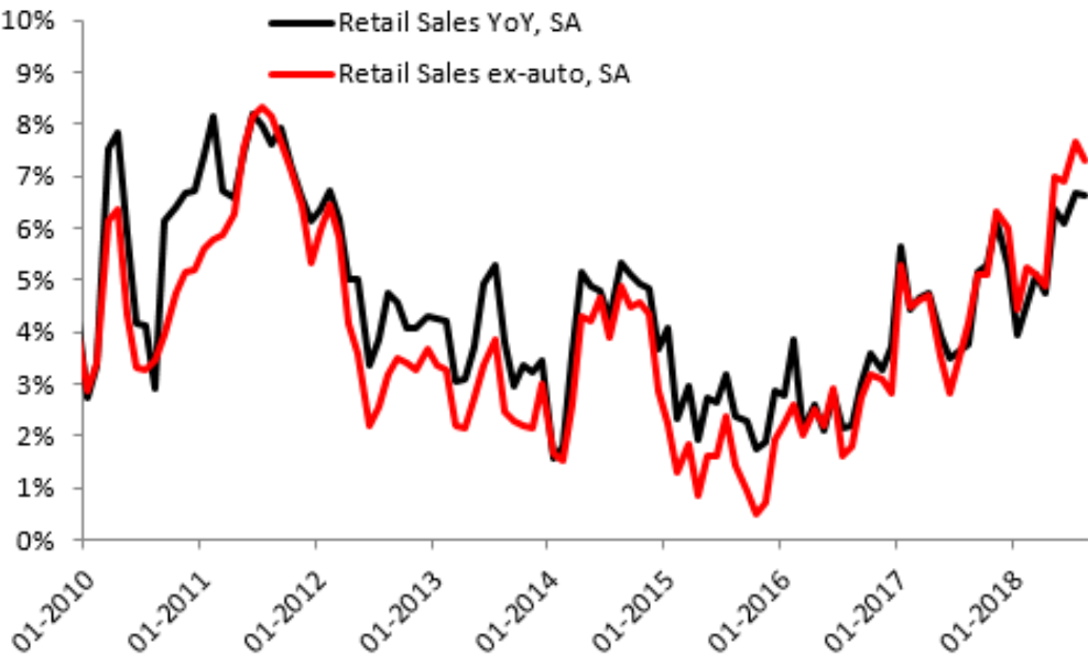 If the month on month variations are smoothed out by looking at year on year data the bigger picture remains pretty positive as far as US retail sales are concerned. Source: XTB Macrobond