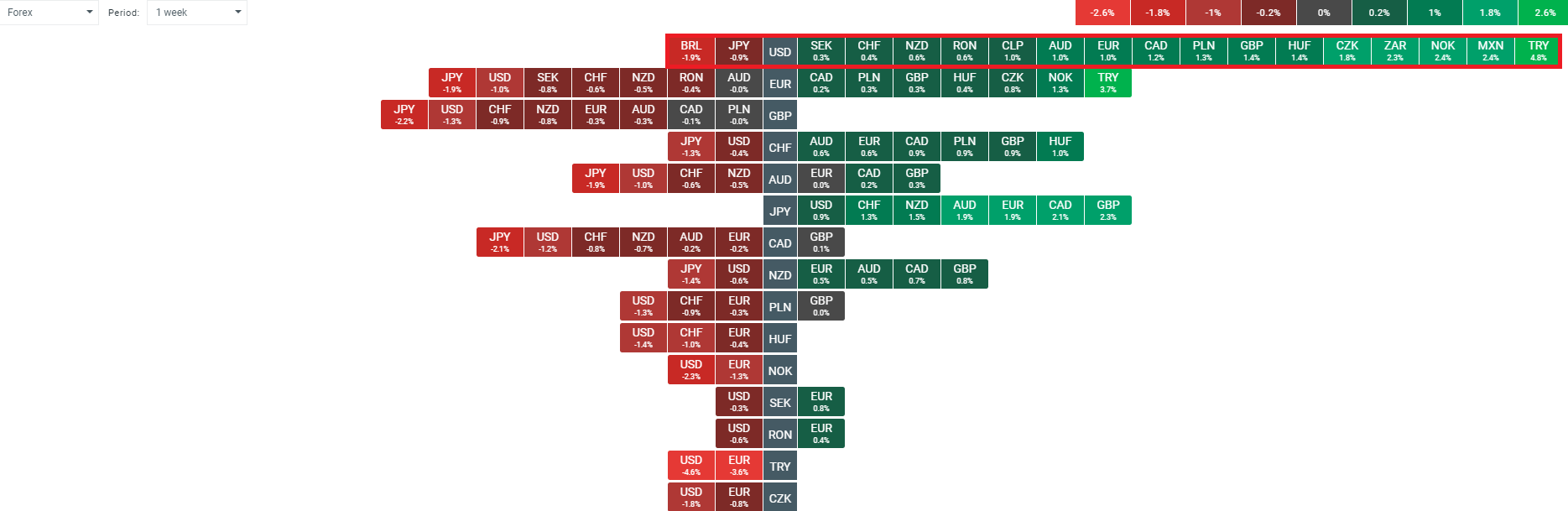 Seeing as it’s Friday afternoon, now is a good time to look back at the week and see what the past few sessions have shown. The US dollar is mixed on the day following the release but looking at the weekly heatmap it is clear it’s been a bad week for the greenback with declines seen against all of its peers barring the Brazilian real and the Japanese Yen. The biggest gainers come predominantly from the emerging markets space with the Turkish Lira the standout performer but also the Mexican Peso and South African Rand have made noteworthy moves higher.
