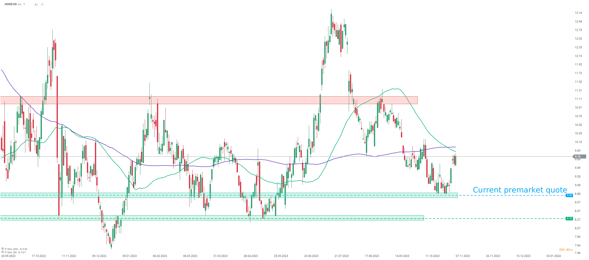 Taking a look at Robinhood Markets chart (HOOD.US), we can see that the stock is expected to launched today's trading with a big bearish price gap. Stock is seen dropping back to the $8.85 support zone. If stock opens in-line with current premarket quote it would mean dropping to the lowest level since early-June 2023. Clearing the $8.85 support would pave the way for a test of the next support zone in-line, which can be found in the $8.30 area.