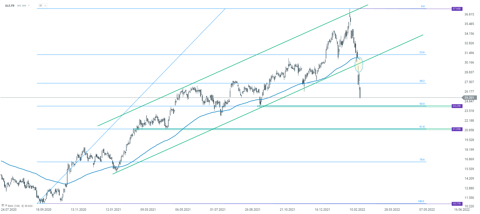 As one of European banks with the largest exposure to Russia, shares of Societe Generale (GLE.FR) were underperforming since the launch of Russian invasion on Ukraine. Stock broke below the lower limit of the upward channel and snapped a mid-term upward trend. Bank's executives say that its Russian exposure is manageable but investors does not seem to be so sure. Source: xStation5