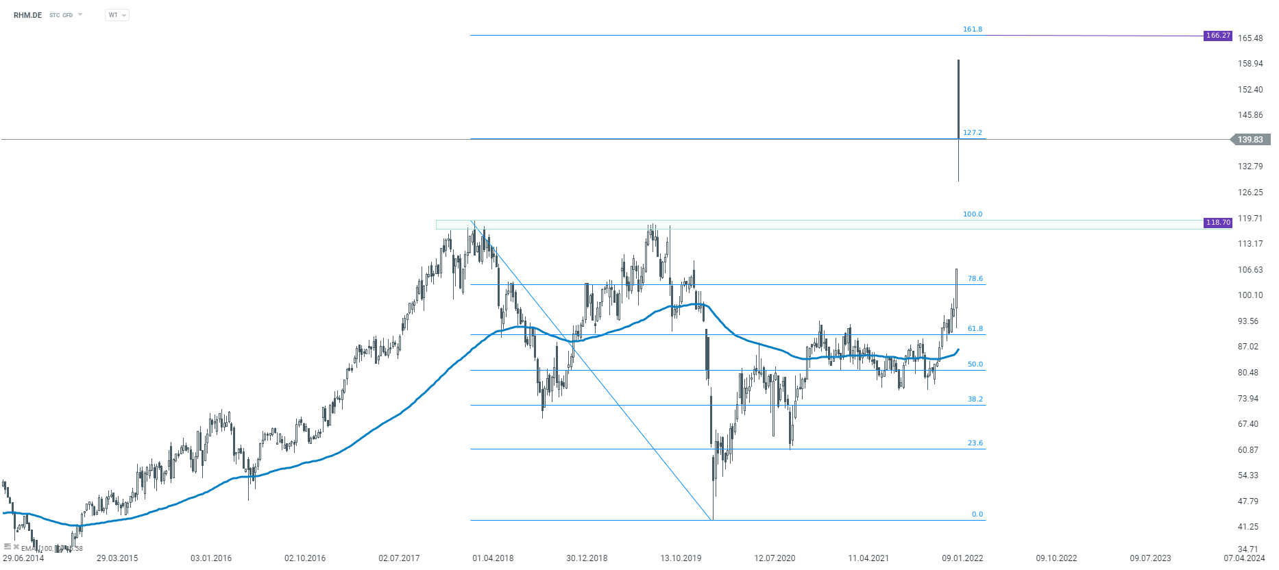 While stocks mentioned above have taken a big hit at the start of this week's trading, there were some stocks that rallied. Tensions in the Eastern Ukraine are increasing and governments are starting to fear that the long period of peace in the Old Continent may be over. As a result, Germany announced that it will boost its defense spending from around 1.5% of GDP in 2021 to above-2% - a NATO target. This in turn has resulted in an almost 50% price rally in stock of German defense company Rheinmetall (RHM.DE). As concerns are not limited to Europe only, traders may expect US defense stocks to also have a good session today.