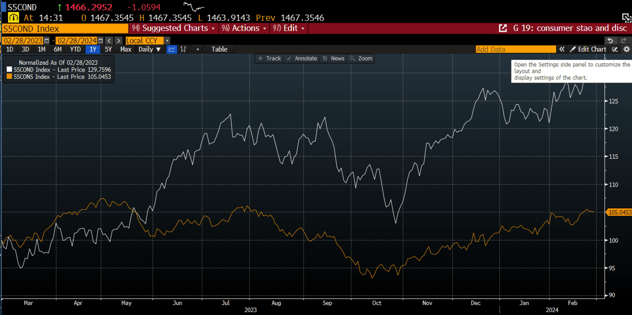 Chart: S&P 500 consumer discretionary sector (white), and consumer staples sector (orange)