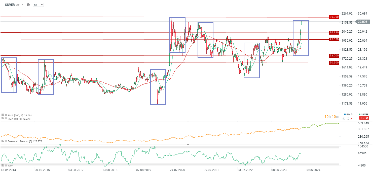 Silver found its highest since January 2021, when it tested the area around $30 per ounce. It's worth noting that on silver we very often see around $7-8 down and up waves. At the moment, such a range has been filled from the local low in February. On the other hand, in the medium term, seasonality continues to point to increases, while net speculative positions are still far from the extreme overbought of 2016 or 2019. It is also worth mentioning the recent inflows of funds into silver ETFs.