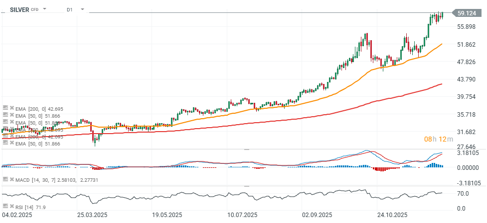 Although USD index futures (USDIDX) have been edging higher over the past few sessions, silver continues to see strong upward pressure. After each of the last two corrections, demand returned rapidly — first after the drop to $45/oz, and then after the pullback to $48/oz. The market is now moving toward the psychologically important $60/oz zone, even though ETFs cut 4.76 million troy ounces of silver from their holdings in the last session, reducing this year’s net purchases to 127.6 million ounces — the largest one-day decrease since October 24. Positive forecasts from industry giant Heraeus are also supporting sentiment.