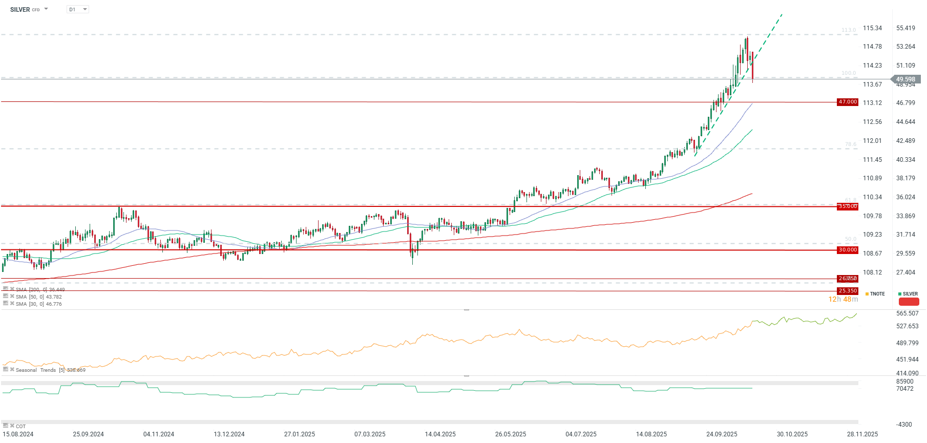 The price is retreating significantly today, falling not only below $50 per ounce but also breaching the 2011 peaks. Furthermore, the accelerated upward trend line, initiated in the second half of September, is being broken. Should this correction extend beyond a one-off profit-taking event, the next key support level will be around $47 per ounce, coinciding with the 30-day moving average.