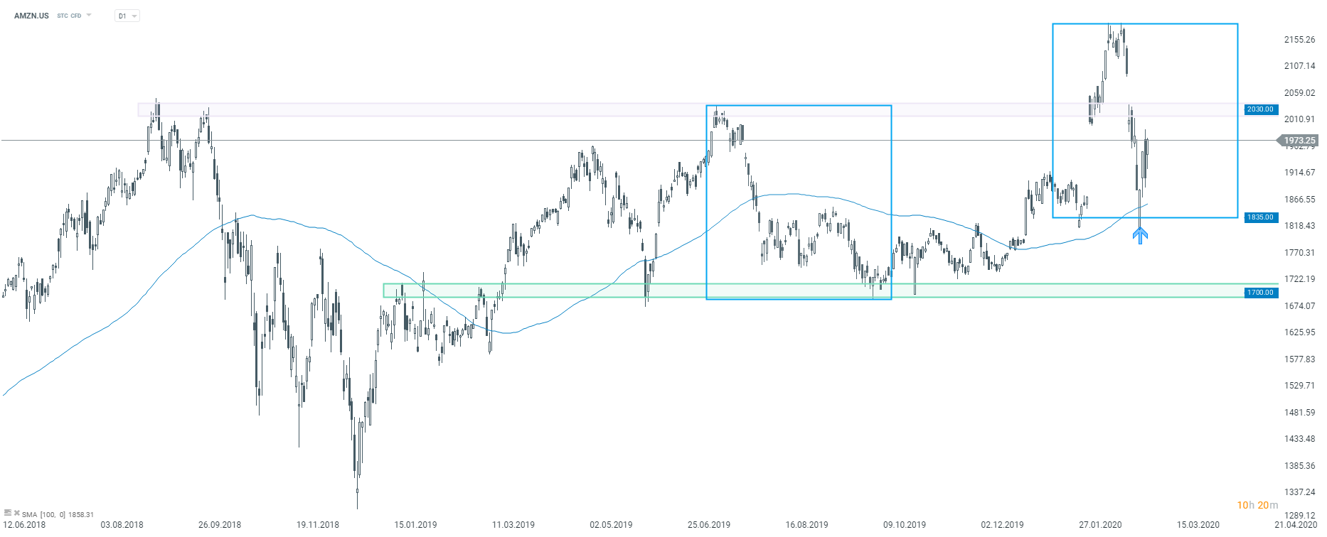 Situation of Amazon (AMZN.US) is similar to that of Facebook - share price tested lower limit of market geometry and moved higher. However, Amazon’s recovery has bigger momentum therefore shares may remain in demand. In such a scenario, the level to watch is resistance at $2030. Source: xStation5