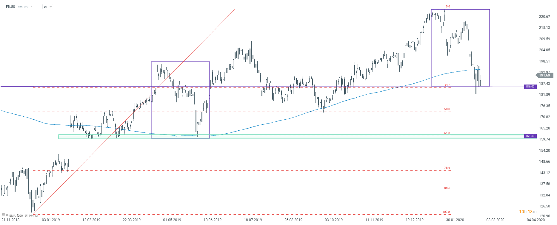 Facebook managed to halt recent declines at the lower limit of the Overbalance structure, that also coincides with the 38.2% Fibo retracement of the upward move started in late-December 2018 ($186). However, an attempt of breaking back above the 200-session moving average (blue line) failed, signalling the woes may not be over yet. In case declines resume and Facebook (FB.US) breaks below the $186 handle, 50% Fibo ($174) will act as the next support. Source: xStation5
