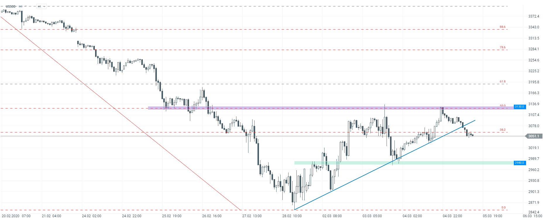 US500 enjoyed a strong recovery at the beginning of this week. However, it looks like fuel for gains is running out and investors are shifting their focus back to coronavirus outbreak. The index broke below the upward trendline today and may be set for a deeper drop. Currently bulls try to halt declines near 38.2% retracement of last week’s downward move. Source: xStation5