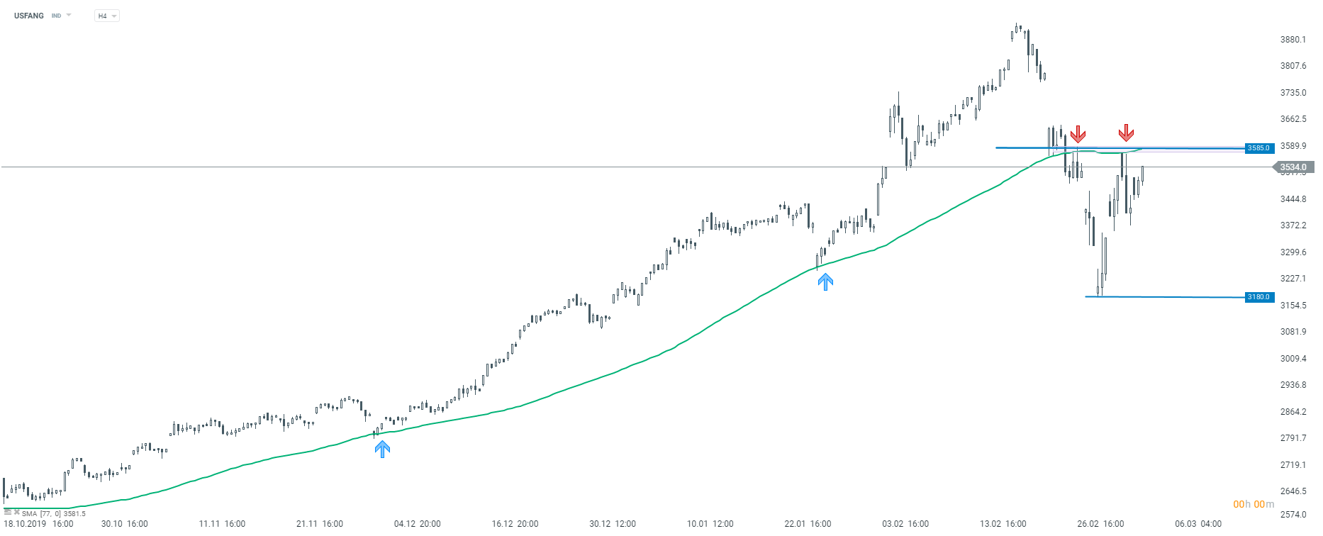 NYSE FANG+ index (USFANG) is in quite an interesting spot. The index made two tests of the 77-period moving average (H4 interval) and recent price action suggests it may be gearing for the third one. Note that this moving average has limited downward moves earlier this year and in 2019 therefore it can be seen as an important resistance. Failure to break above it may doom index to slide back all the way to 3180 pts. Source: xStation5