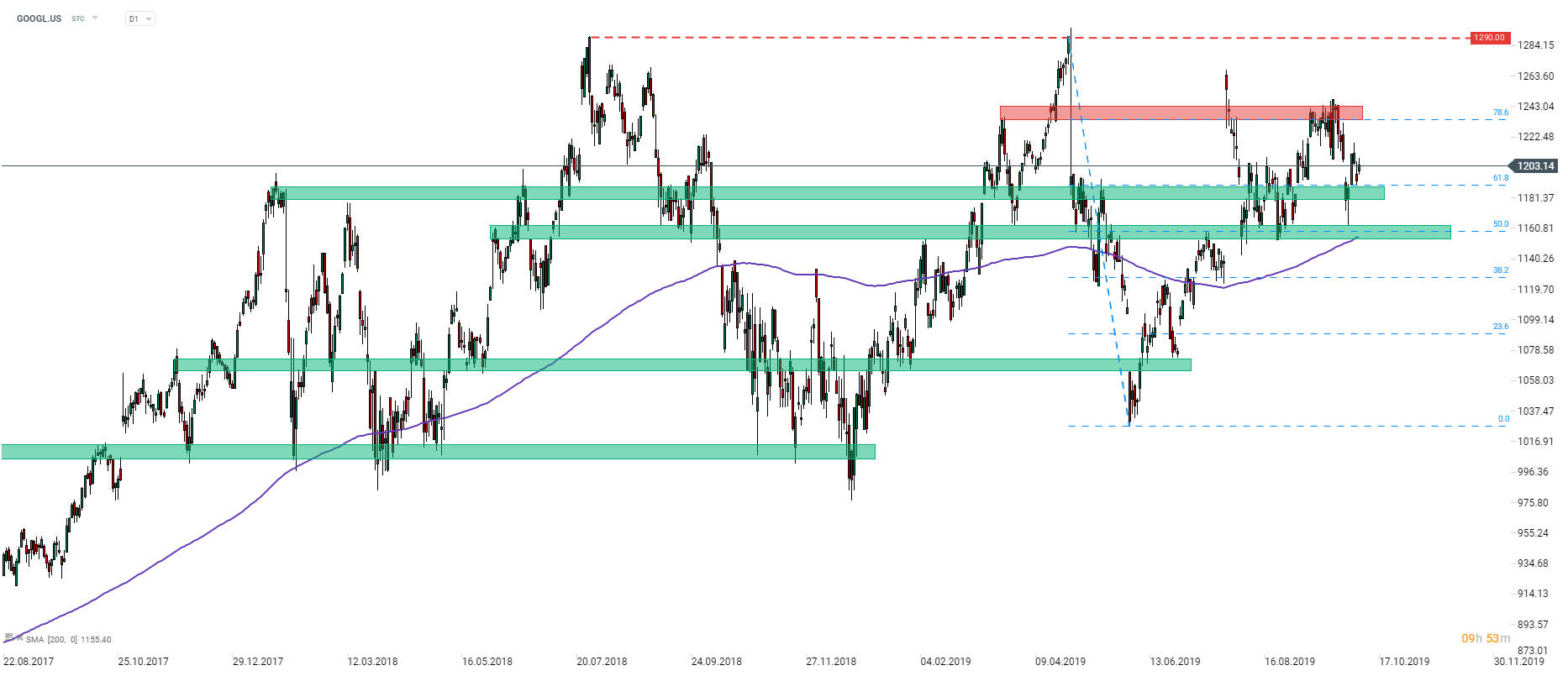 2019 has been a tumultuous year for Alphabet (GOOGL.US) shareholders. Following a gain of around 25% in the first 4 months, share price slumped 20% in May. Another 20+% gain occurred later on and after a brief pullback the stock is on the rise again. Price bounced off the 50% Fibo level of May’s decline ($1160) and climbed back above the $1200 mark. The focus now shifts to the resistance zone ranging above the 78.6% Fibo level ($1235) as it is the last hurdle ahead of all-time high at $1290. Product event scheduled for next week could be a major driver for the stock. Source: xStation5