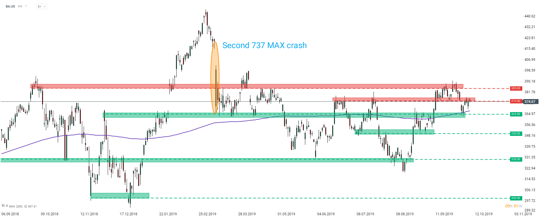 After steep declines following the second 737 MAX crash in March, the share price of Boeing (BA.US) started to move sideways. The stock pulled back from the upper limit of the range at the end of September but found support at the 200-session moving average (purple line) and resistance zone ranging around $365 handle. As long as 737 MAX planes remain grounded, any bigger upward move looks questionable. However, the lifting of a ban could be a trigger for larger rally. The nearest resistance levels to watch are zones at $375 and $385. Source: xStation5