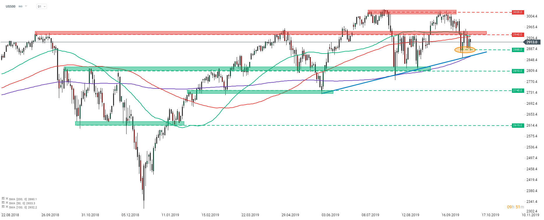 In spite of another steep dive, S&P 500 (US500) index managed to stay above the upward sloping trendline. While the earnings season begins in a full swing next week, the index is also likely to enjoy elevated volatility today and tomorrow due to Sino-US trade talks. The closest zones to watch are the resistance above 2940 pts and support at 2885 pts swing level. However, one should keep in mind that 50-session moving average (green line) is nearing a break below 100-session moving average (red line) and threatens painting a death cross - a bearish technical pattern. Source: xStation5