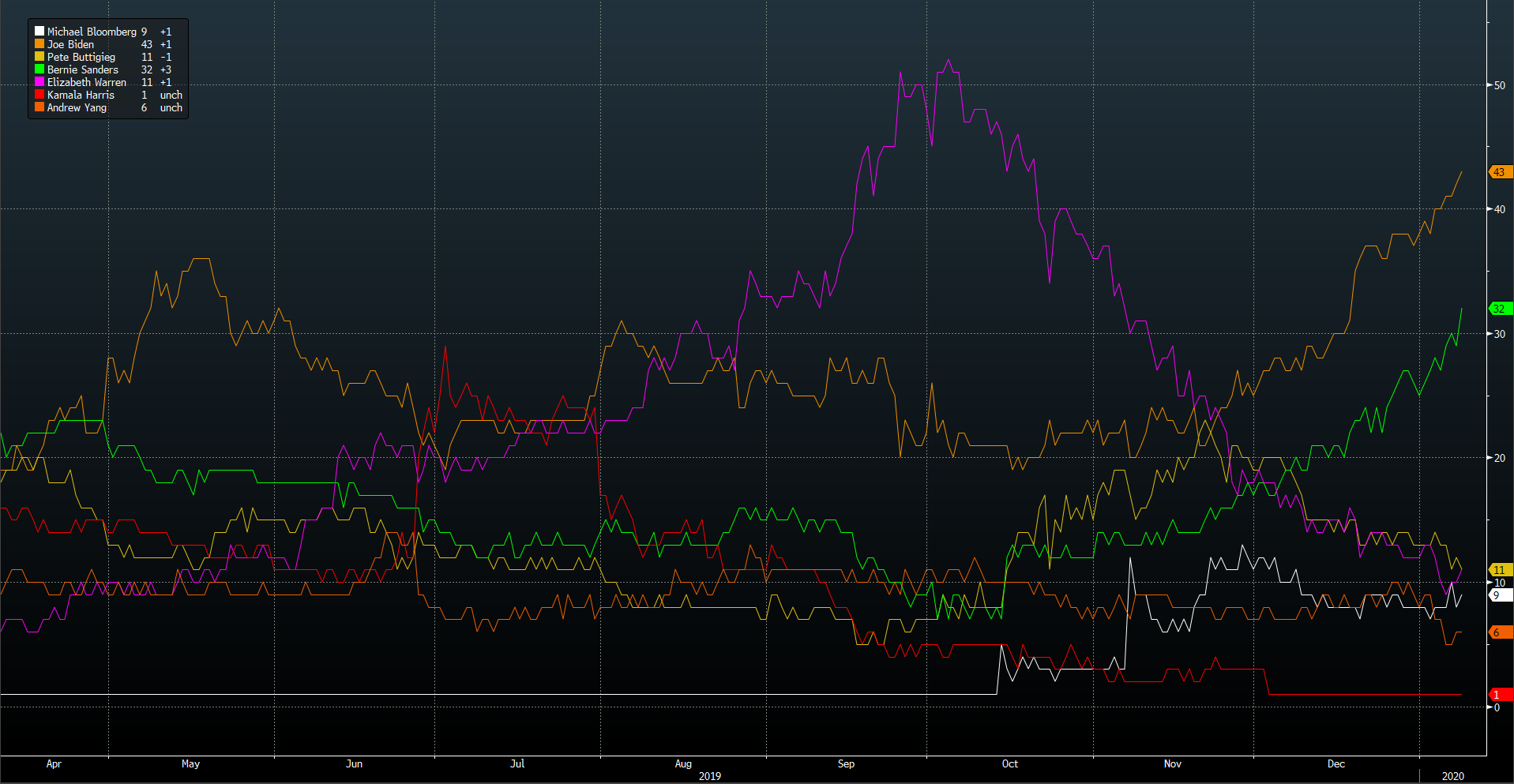 Joe Biden (top orange line) has a solid lead over Bernie Sanders (green line) and other Democratic candidates. However, nothing should be taken for granted as support for Elizabeth Warren (purple line) sank from around 50% to 10% in just three months. Elections will take place on Tuesday, November 3. Source: Bloomberg