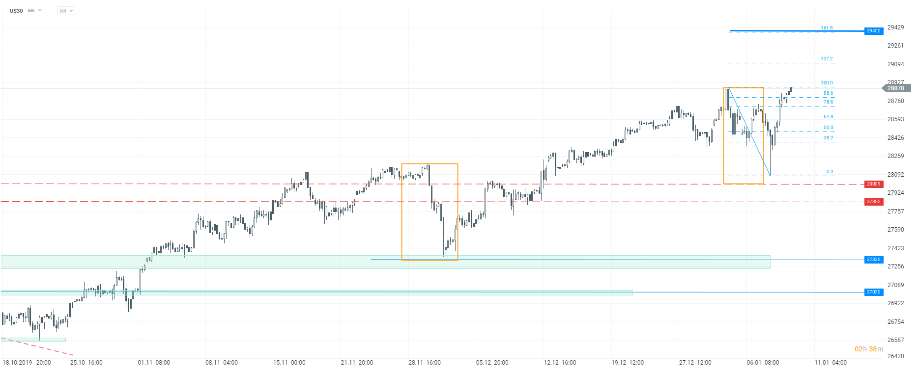 2019 has been quite a tough year for the economy but it did not stop the US stock market indices from rallying over 20% (S&P 500 added almost 29%!). Technical situation is quite tricky as major indices - S&P 500, Dow Jones and Nasdaq - trade at all-time highs and it is hard to determine potential resistance levels going forward. Taking a look at the Dow Jones, one can see that the index is testing the upper limit of the market geometry marked by an ATH. The next resistance can be found at the 161.8% Fibonacci retracement level of the recent decline (29400 pts area). A point to note is that in case the index was to mimic average performance during election year won by Democrat (+3.07%, the lowest out of the aforementioned averages) the index would finish at around 29415 pts. Mimicking average performance from election years won by Republicans would put the index at 30335 pts by the end of the year!