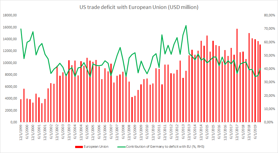 The United States runs a persistent trade deficit with the EU that is only deepening over time. In case of a major EU-US trade conflict, the US may target German goods with tariffs as the country is the biggest contributor to the situation. Source: Bloomberg, XTB Research