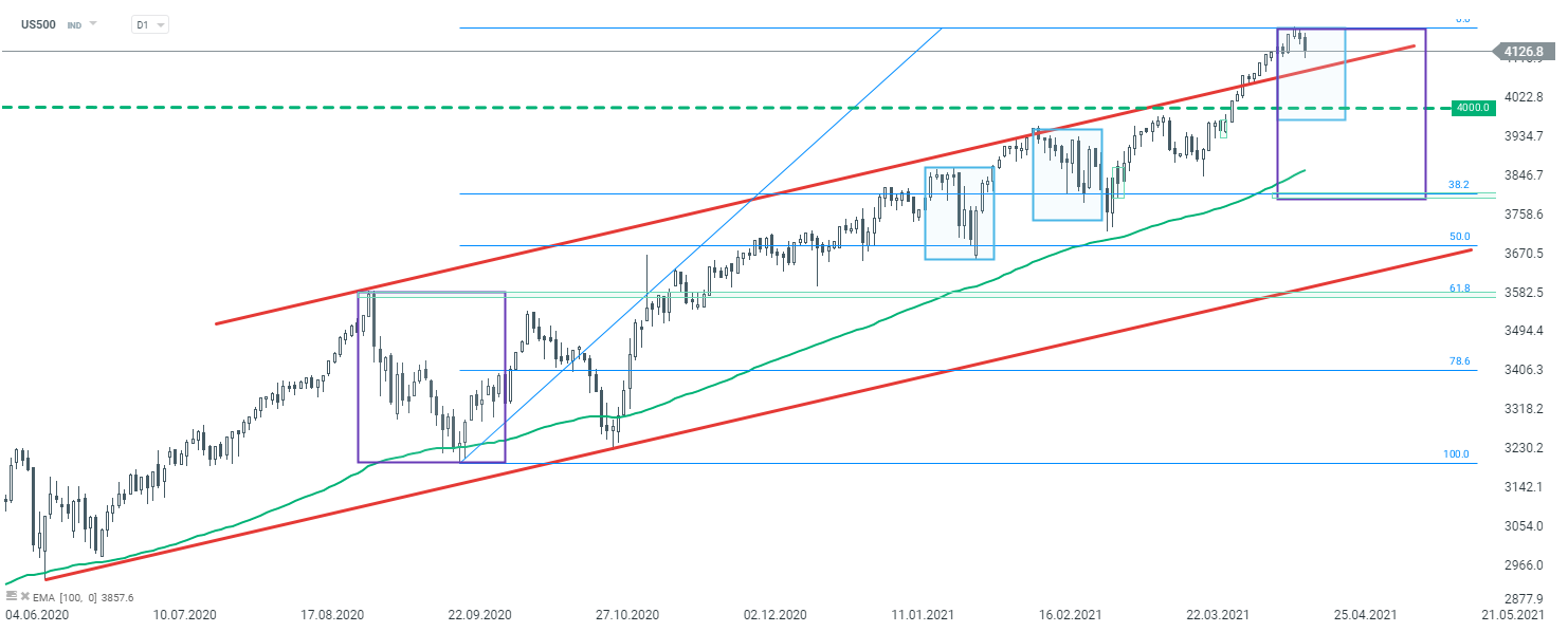 As for the technical situation on Wall Street, let's take a look at the S&P500 index, which fell over 0.8% today. Looking at the D1 interval, the situation looks slightly better compared to DAX. This index has been in an uptrend for a long time and is still trading way above the upper limit of the ascending channel. Nevertheless, when looking at the market in a broad sense, it can be observed that deeper corrections occurred in the past. If the downward trend intensifies then the nearest key support is located at 4,000 pts and is marked with the lower limit of the blue 1: 1 structure. In turn, the largest correction structure is marked with 38.2% Fibonacci retracement and is located around 3800 pts. Only a break below this level will indicate a change in sentiment on the US index.