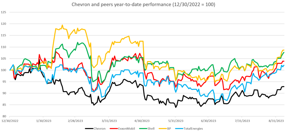 In spite of S&P 500 trading over 16% year-to-date higher and Brent gaining 5% so far this year, Chevron stock has been struggling. Shares are trading 7% below 2022 close and are clearly underperforming other oil supermajors, like for example ExxonMobil (+3.8%), Shell (+7.7%), BP (+8.6%) or TotalEnergies (+2.1%). This can be to some extent explained with company-specific factors like employee strikes at Chevron LNG plants in Australia. However, the main reason looks to be Chevron's relatively weaker fundamentals. ExxonMobil is the best peer for comparison as both stocks are US-domiciled and this comparison shows that ExxonMobil has been achieving higher rates of return on assets and common equity than Chevron.
