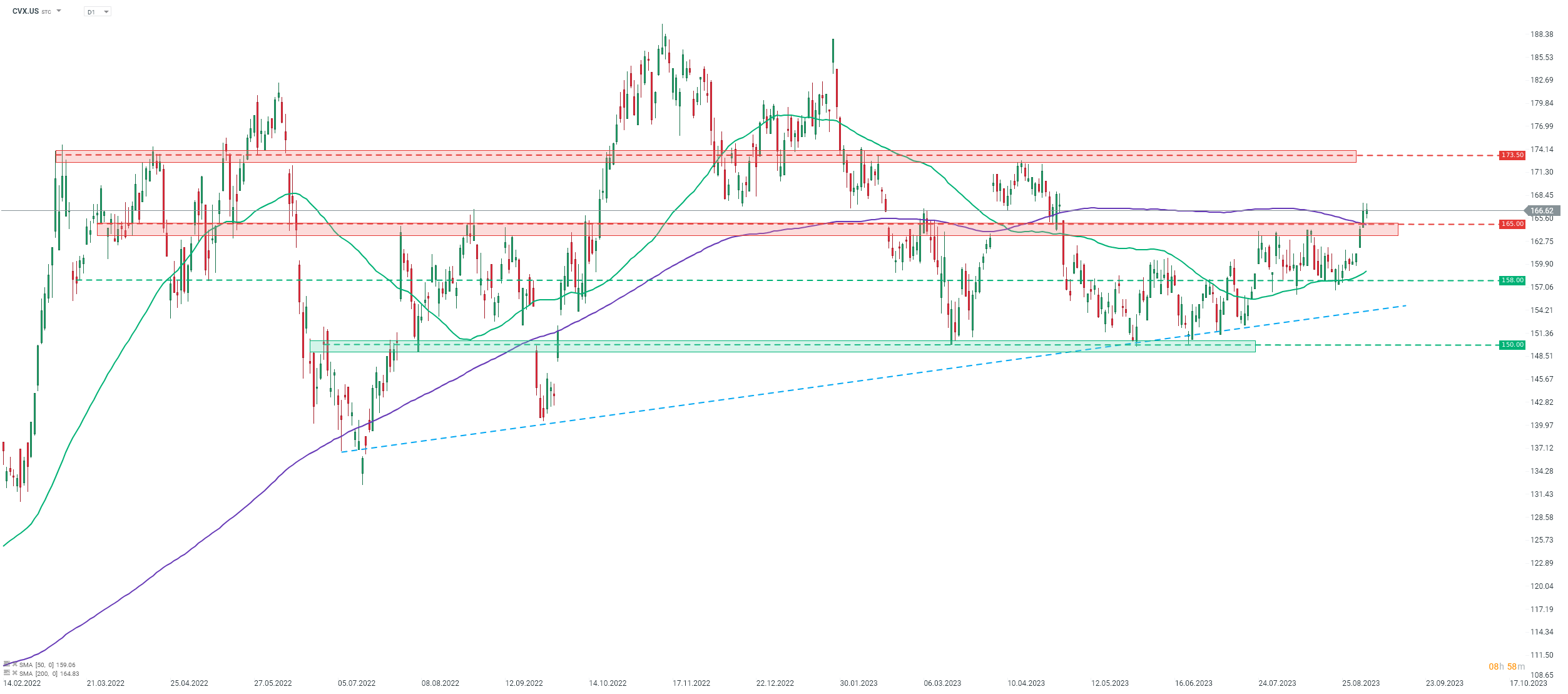 Chevron's share price moves have been more closely resembling oil price moves so far this year. However, it should be said Chevron has been underperforming oil since the end of Q2 2023. Source: Bloomberg Finance LP, XTB