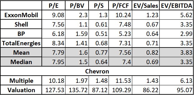 Chevron is trading at a higher multiple than ExxonMobil in almost every case, spare for Price-to-Book-Value. Multiples for Shell, BP and TotalEnergies are even lower but this can be reasoned with a generally weaker performance of European stock markets compared to Wall Street. A point to note is that valuing Chevron using mean multiples would result in a below-market valuation in every case, with EV/Sales showing the lowest valuation (48% below Chevron's current market price). The highest valuation - from mean P/BV multiple - is still around 18.5% below current market price of Chevron.