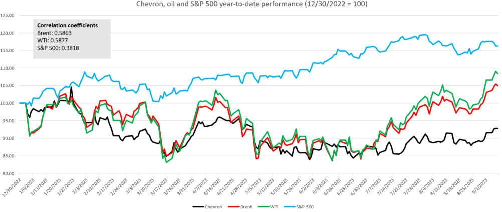 What should not come as a surprise is the fact that Chevron's stock is to a huge extent reliant on oil prices. Taking a look at the chart below, we can see how Chevron's stock performed compared to oil price and S&P 500 index this year. However, if we consider 5-year correlation coefficients, the story looks different. Correlation coefficient of daily returns of Chevron and Brent over the past 5-years was around 0.50 while that of Chevron and S&P 500 was around 0.62. However, this discrepancy between 5-year correlation and year-to-date correlation can be easily explained - AI craze! S&P 500 has enjoyed strong gains this year, especially at the beginning of the year, as it was being propped up by a rally in AI-related tech shares.