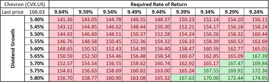 Sensitivity matrix for Chevron's Gordon Growth Model. Source: XTB Research
