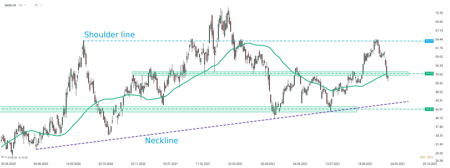 A look at DraftKings (DKNG.US) chart at D1 interval shows us that a major technical pattern may be building up. Stock pulled back at the beginning of September after a failed attempt of breaking above the $64.00 handle, marked with a local high from October 2020. As a result, the right shoulder of the head and shoulders pattern may have been painted. Neckline of this pattern is marked with the upward trendline and this is a key support to watch. Breaking below could hint at a large downward move. Source: xStation5