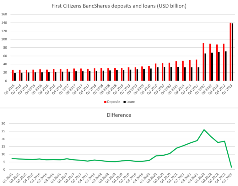 First Citizens BancShares reported Q1 2023 earnings on Wednesday before opening of US markets. Report turned out to be much better than expected by analysts. Bank reported a massive 57% QoQ increase in deposits and 95% QoQ jump in loans. However, such a massive increase in deposit and loans was driven by a one-off event that occurred at the very end of the quarter - acquisition of loans and deposits from collapsed SVB on March 27, 2023. Company reported a $9.82 billion gain on SVB acquisition. After accounting for increased provisions for credit losses, the company's total net income reached $9.51 billion, making First Citizens BancShares the second most profitable US bank during the quarter (trailing only behemoth JPMorgan which earned $12.6 billion).