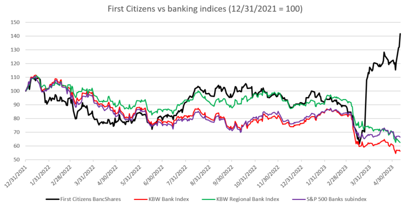 First Citizens BancShares began to rally after SVB acquisition while broad banking sector indices continued to struggle. Source: Bloomberg, XTB