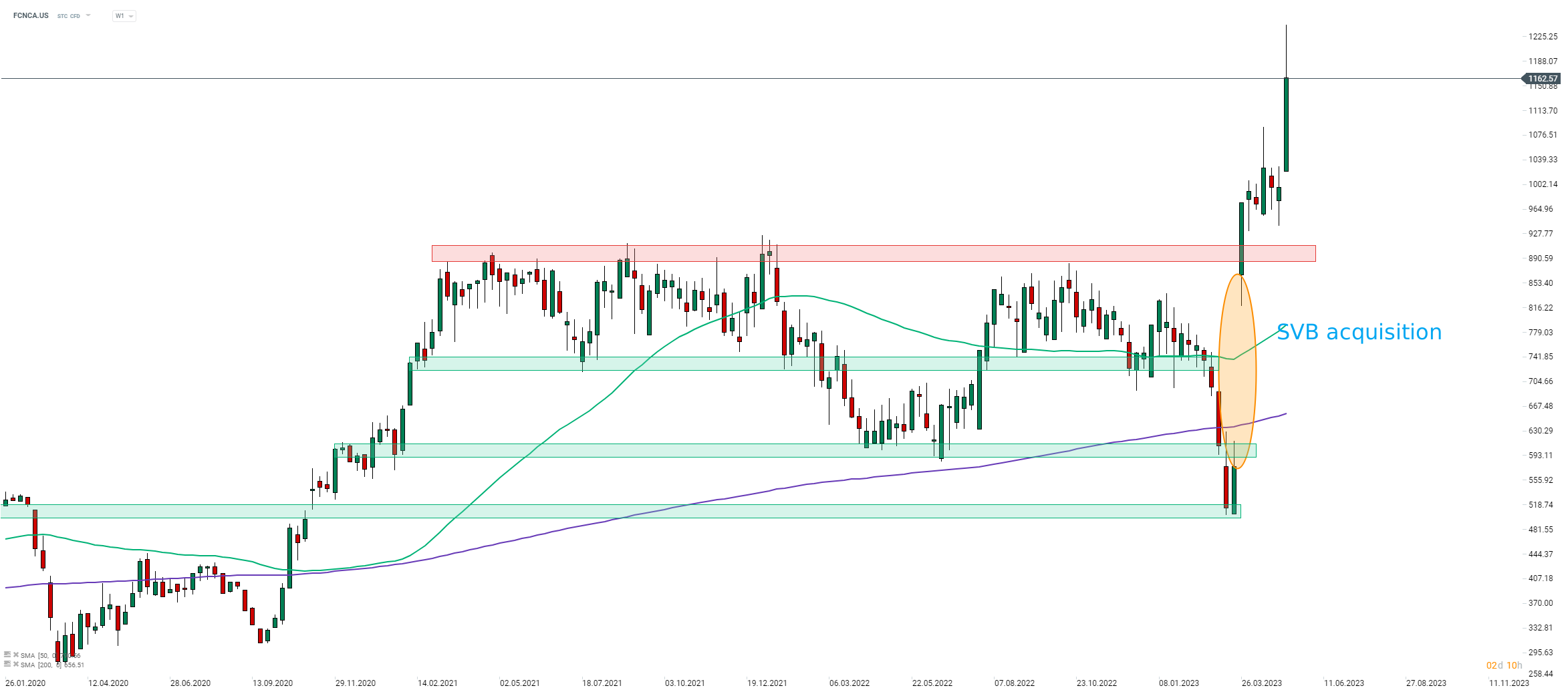 While the majority of US bank stocks still lick their wounds after a recent turmoil in the banking sector, especially regional banks, there is one US bank that has just reached a fresh all-time highs - First Citizens BancShares (FCNCA.US). This Bank has been enjoying an upbeat sentiment since the second half of March, when it acquired loans and deposits of a collapsed Silicon Valley Bank. Shares of First Citizens leaped higher this week again after the bank published a Q1 earnings report that included details of SVB acquisition.