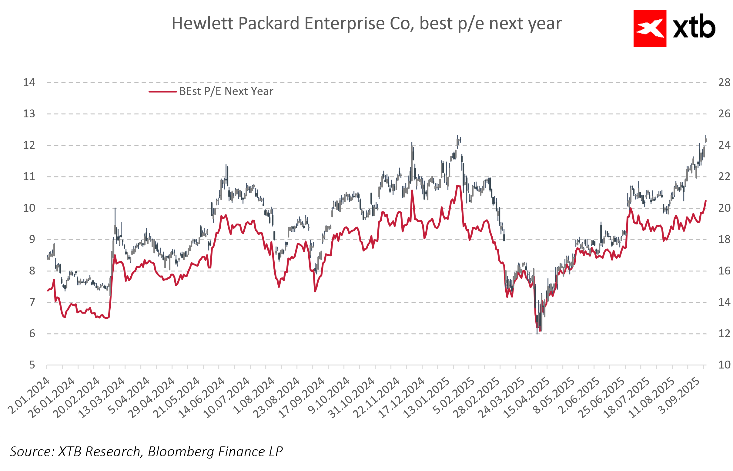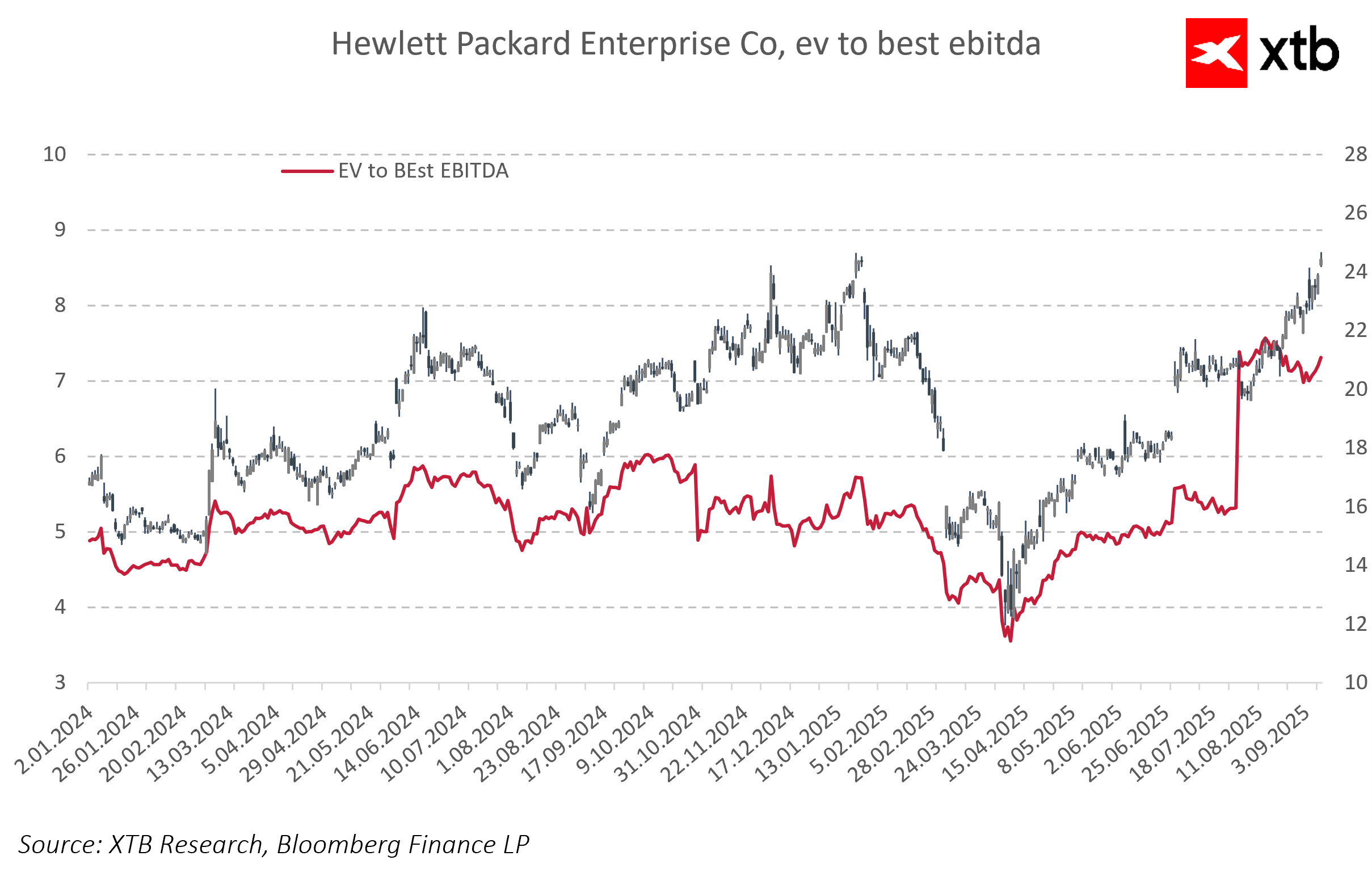 Currently, Hewlett Packard Enterprise is valued by the market at moderate multiples; however, there is a clear upward trend in key valuation metrics such as the P/E ratio (price-to-earnings) and EV/EBITDA. The P/E ratio for the next four quarters is currently around 10.5–11, representing a significant increase compared to the beginning of the year, when it was approximately 7–8. Similarly, the EV/EBITDA ratio has risen from around 4.5 to over 6.5. This movement in multiples may indicate growing investor confidence in the company’s continued growth and improving financial performance.
