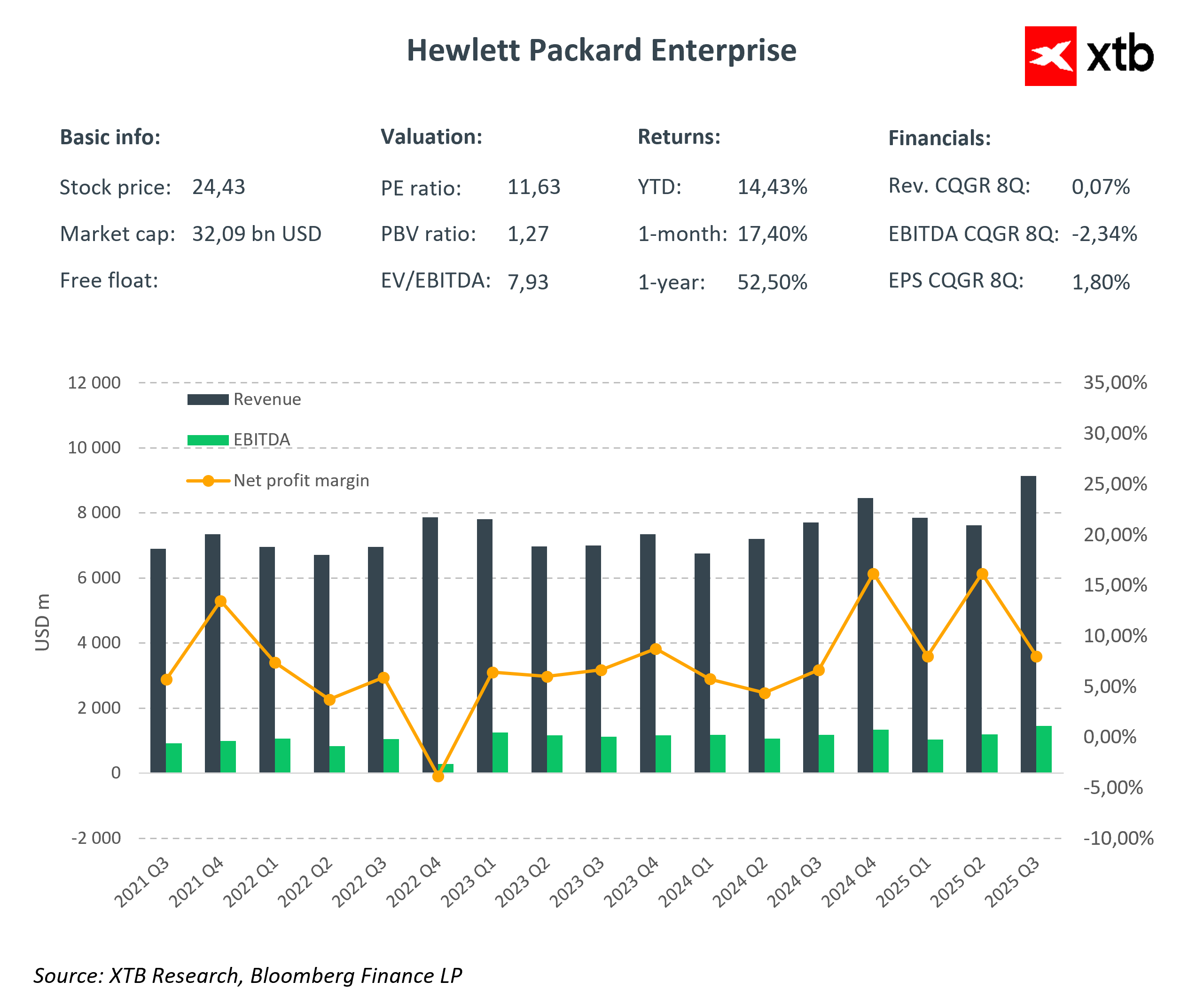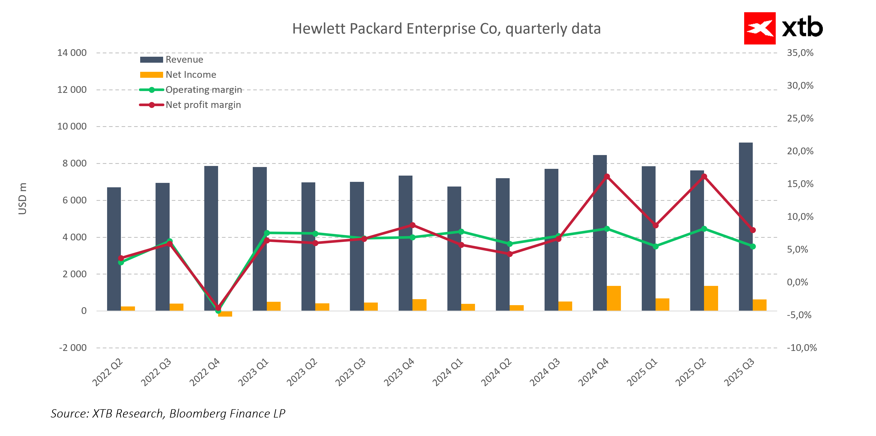 Hewlett Packard Enterprise (HPE.US) reported its Q3 FY2025 results, which positively surprised the market and confirmed the company is steadily executing its growth and transformation strategy. Revenue increased by an impressive 19% year-over-year, reaching $9.13 billion, surpassing analysts’ expectations of $8.96 billion. The key driver of this growth was the acquisition of Juniper Networks, which significantly strengthened HPE’s networking segment, along with rising customer demand for advanced infrastructure solutions and networking technologies, including 5G and hybrid cloud offerings.