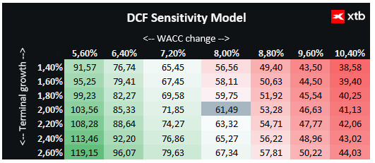 The valuation largely depends on assumptions regarding revenue growth rates and the cost of capital. Below, we present a scenario matrix illustrating how changes in these parameters affect the company’s valuation.