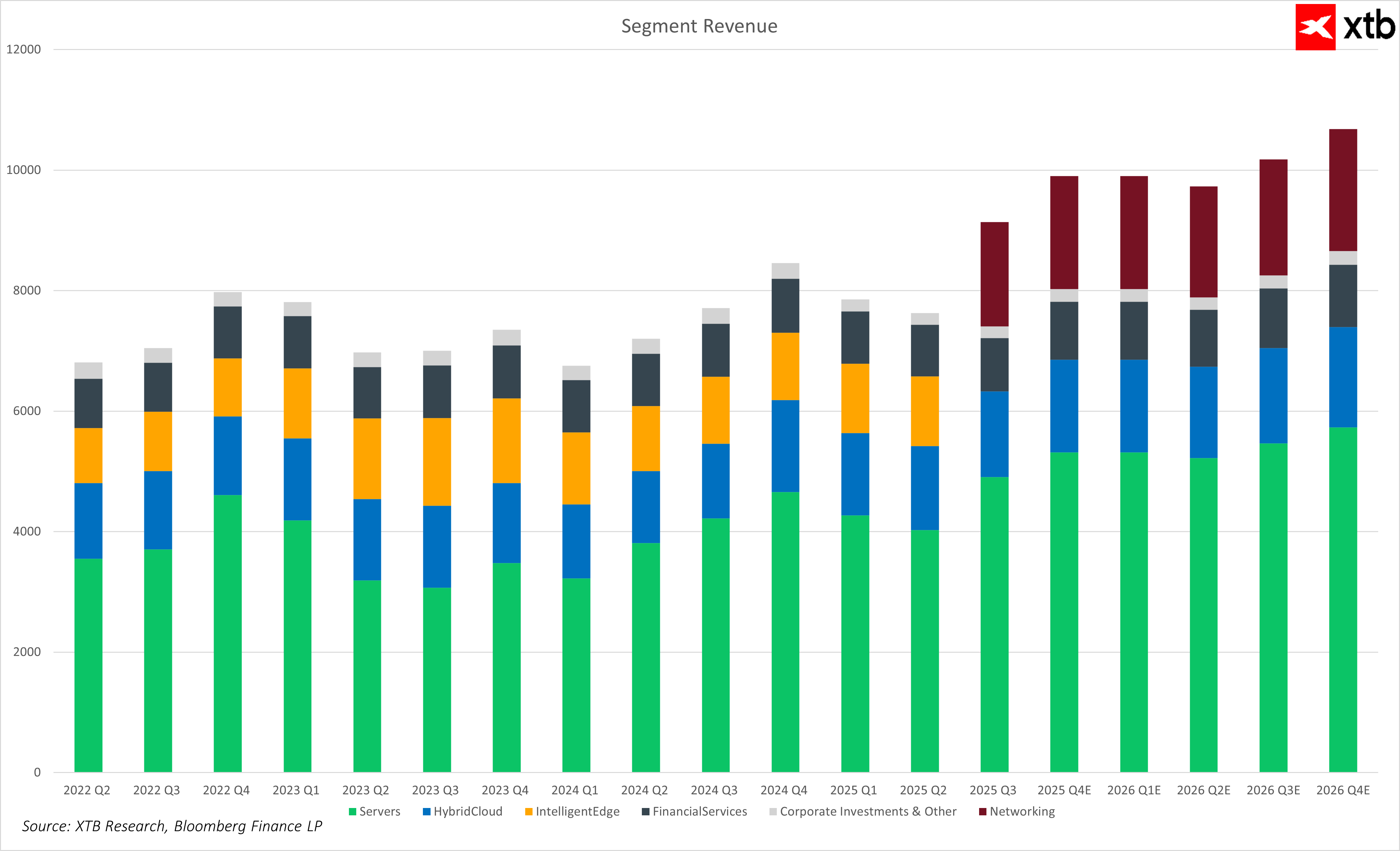 An analysis of the contribution of Hewlett Packard Enterprise’s (HPE) individual segments to the company’s revenue indicates solid foundations and a balanced business structure. The Servers segment remains the most important revenue pillar, currently generating approximately 54% of total income. Maintaining such a significant share reflects the stable position of this segment in the server infrastructure market, which is crucial in the context of the development of cloud solutions and the digital transformation of enterprises.