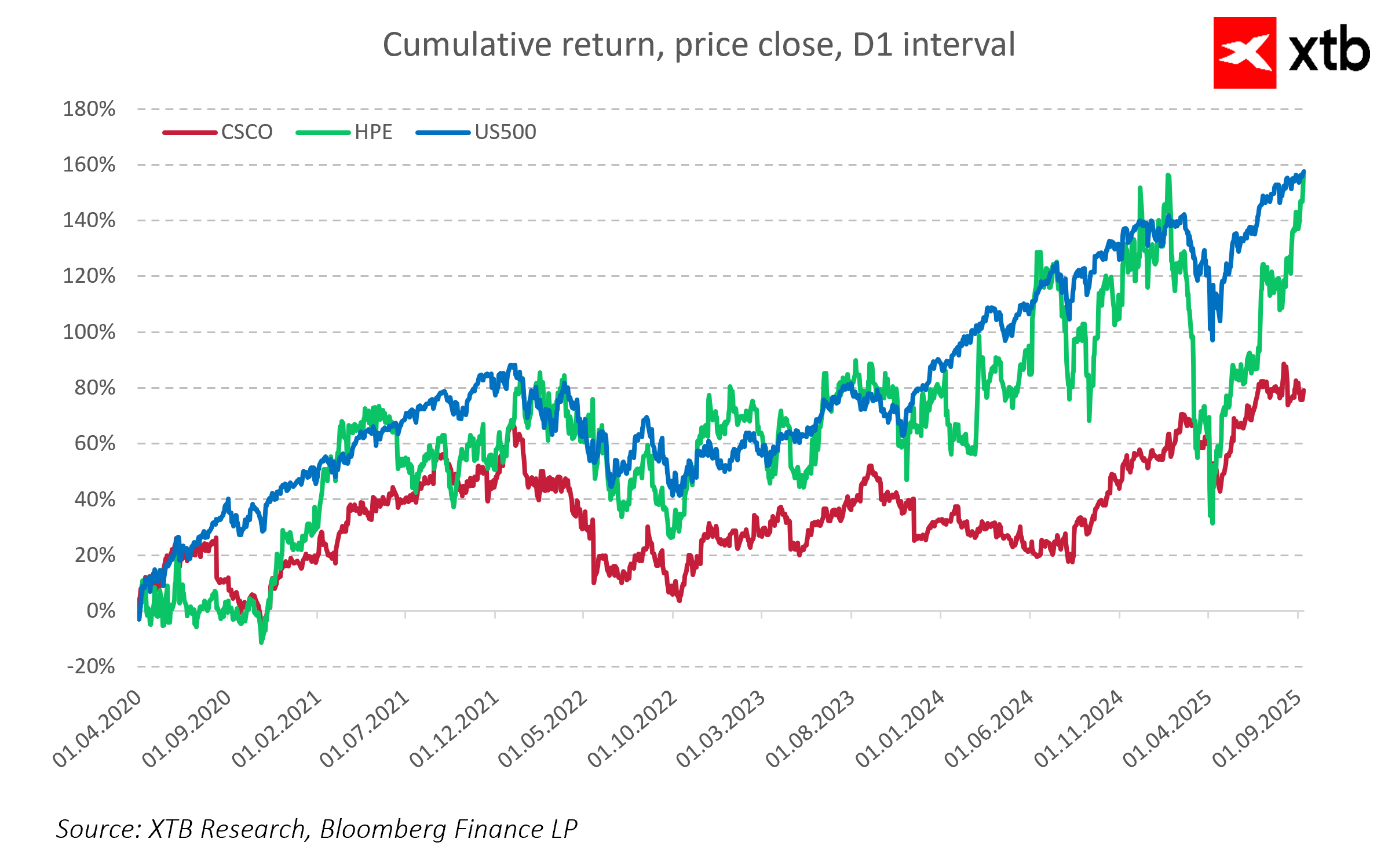 Since 2020, shares of Hewlett Packard Enterprise (HPE) have gained over 140%, significantly outperforming Cisco (CSCO), which rose approximately 80% over the same period. HPE has also kept pace with the S&P 500 index, which increased by around 150%. This demonstrates that the company not only outpaced a direct competitor but also maintained a strong position relative to the broader market. These results highlight HPE’s attractiveness as an investment in the IT and cloud solutions sector, underlining its ability to generate higher returns compared to major players and the equity market as a whole.
