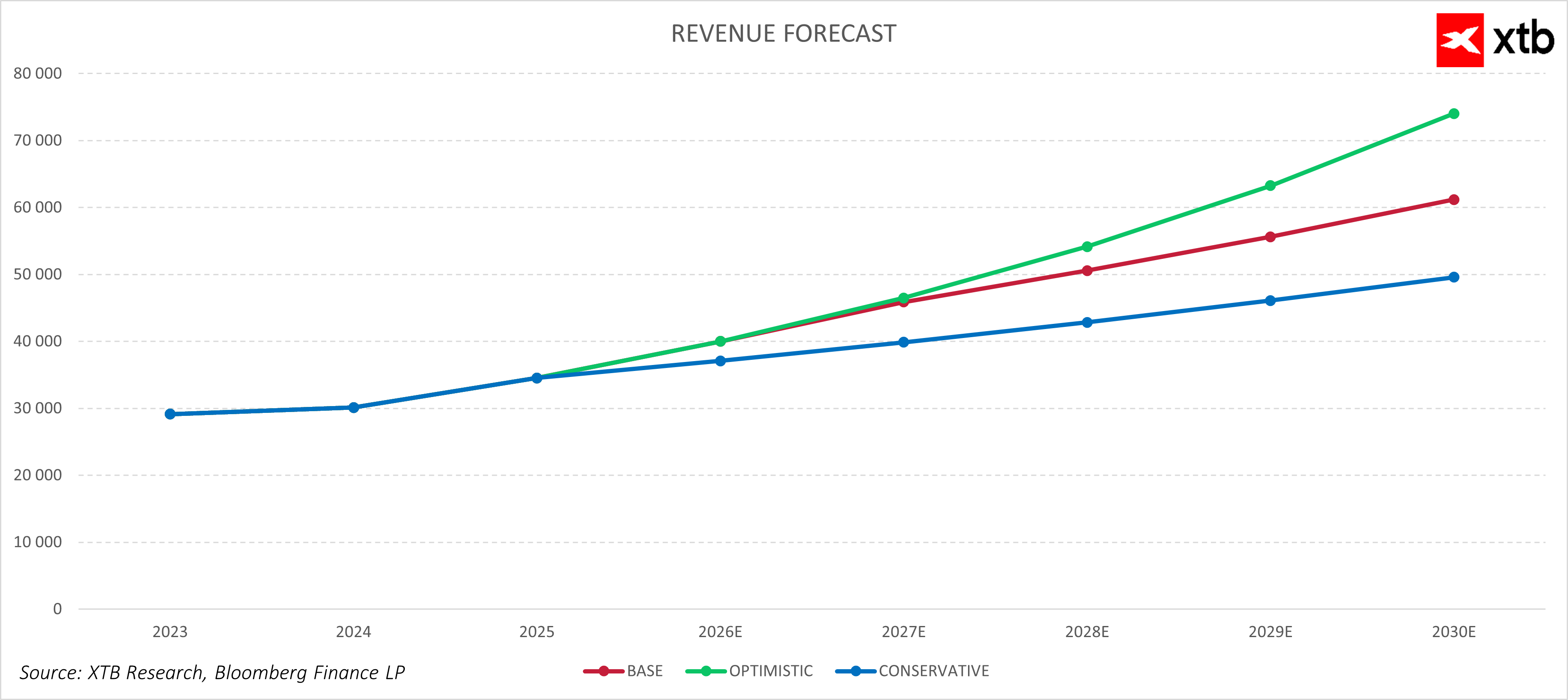 The revenue forecast chart presents three scenarios for the company’s development: base, optimistic, and conservative. In the base scenario, revenues grow steadily from approximately $30 billion in 2024 to about $63 billion in 2030, reflecting realistic market expectations based on current trends. In this scenario, the company rapidly expands its main business segments in the early years, with growth moderating somewhat in later years due to market maturation and saturation.